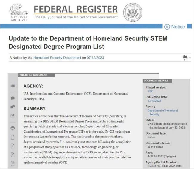 根据《联邦公报》7月12日消息,美国国土安全部和移民局联合宣布将对STEM专业范围修订,新增8个专业领域。