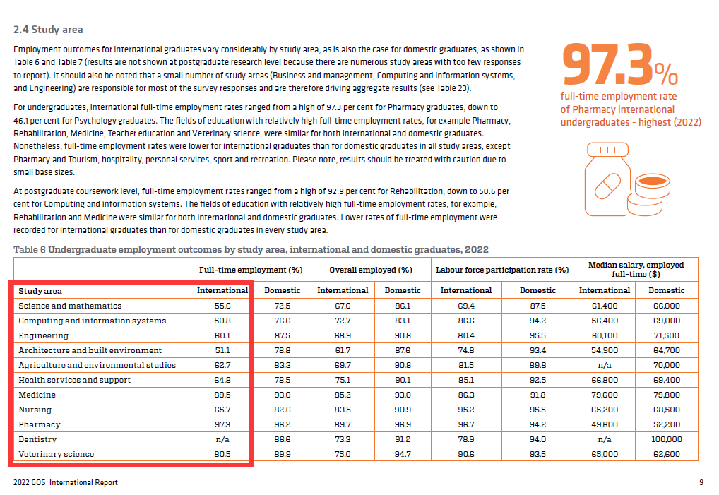 根据今年2月出炉的2022澳洲毕业生成果调查报告,2022年国际毕业生本科就业率较高的几个专业主要还是集中在医疗相关行业,就业率最 高的前十位依次为: