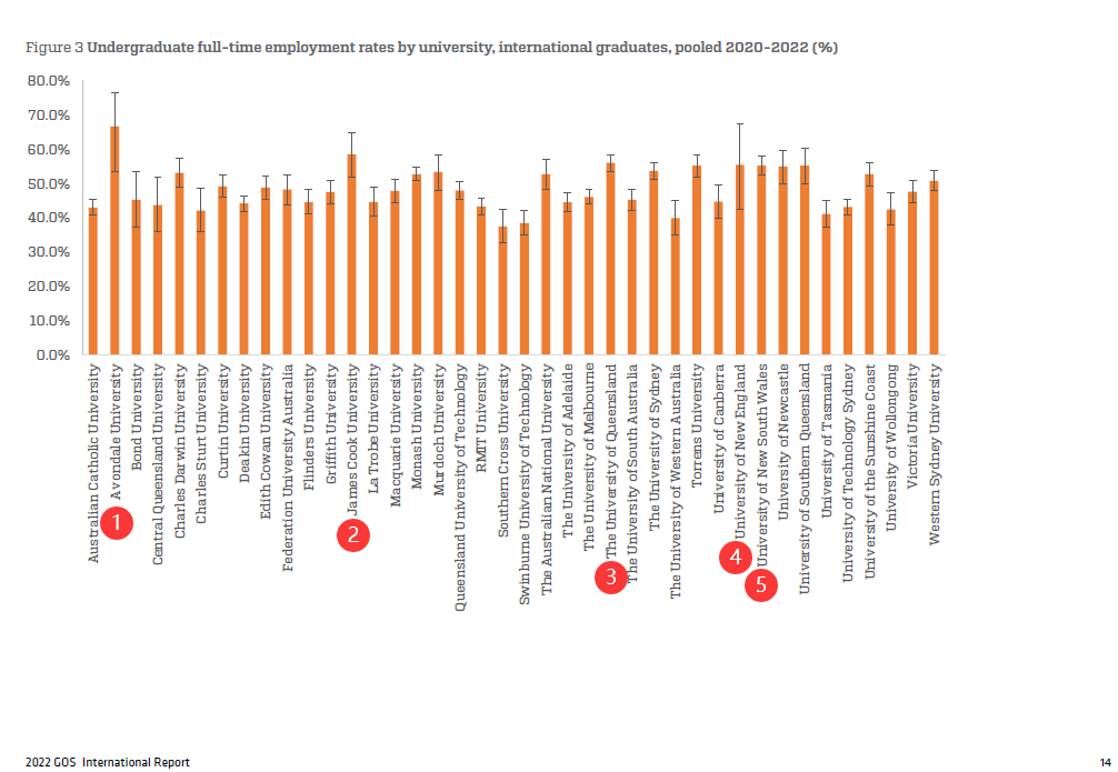 据近三年数据来看,全职就业率最 高的大学前5位大学中,依次为雅芳黛尔大学Avondale University 66.7%、詹姆斯库克大学James Cook University 58.6%、昆士兰大学University of Queensland 56.1%、新英格兰大学University of New England 55.6%和新南威尔士大学55.3%。