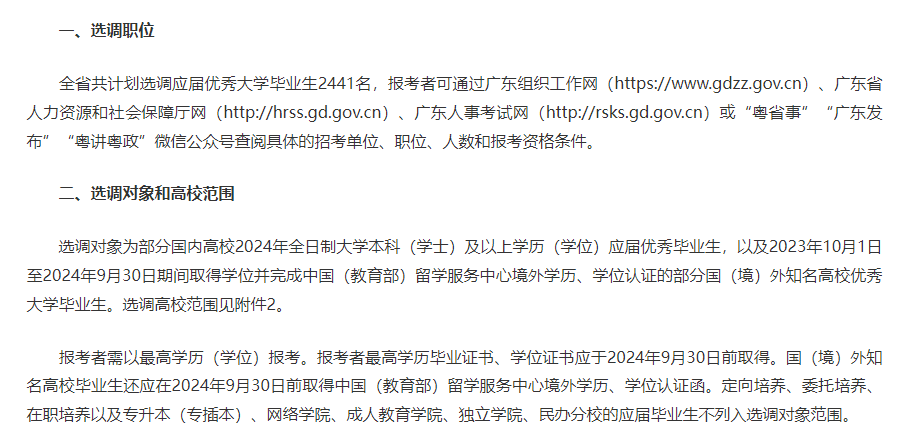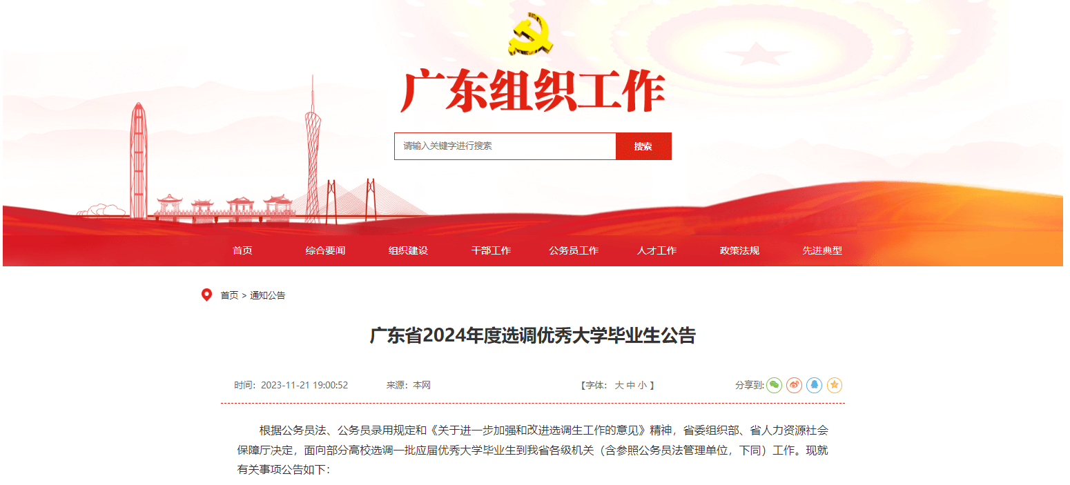 广东省发布了2024年度选调优秀大学生毕业公告。