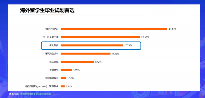 在过去的数据统计中,有17.73%的留学生毕业之后会选择考公务员,定向选调从而也成为留学生们的重要途径。