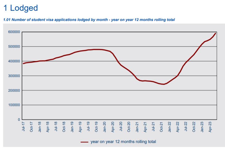 澳洲移民局数据显示:22-23财年累计共收到59万份学生签证的申请。这个数字与去年同期相比,涨幅达62%。这说明,在经历了疫情低谷之后,澳大利亚留学申请重回巅 峰!