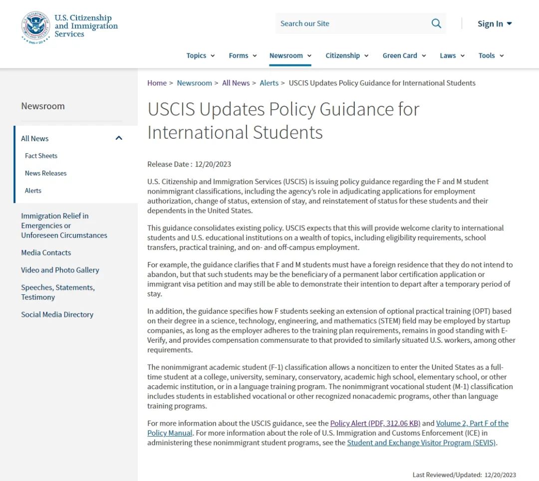 12月20日,美国移民局(USCIS)在官网上发布了针对国际学生的政策更新,内容针对留学生及其家属在美国的就业授权申请、身份变更、居留延期和身份恢复申请等问题,作出了明确解答。