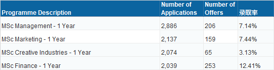 其次是MSc Teaching English to Speakers of Other Languages和MSc Education专业,申请量都超过了1500。这两个专业的录取率相对来说还不错,都达到了30%以上。