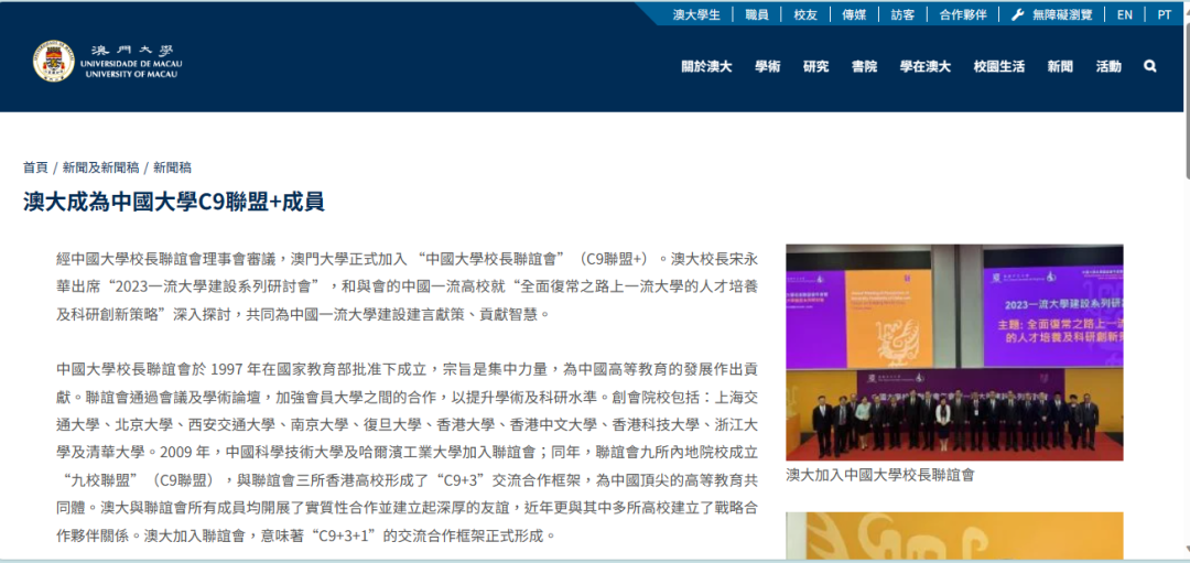近期,经中国大学校长联谊会理事会审议,澳门大学正式加入 “中国大学校长联谊会”(C9联盟+)。