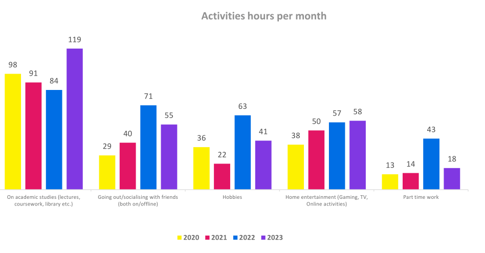调查显示,2023年英国大学生用在学习上的时间平均为每月119小时,包括在校学习、参加讲座以及在图书馆学习等。相比2022年增加41.7%!可以说是显著增长了!